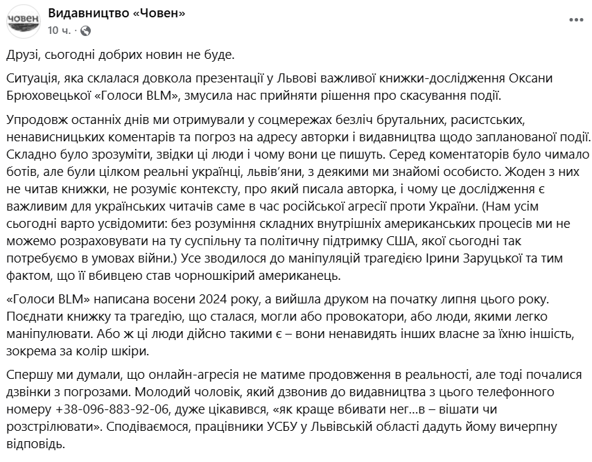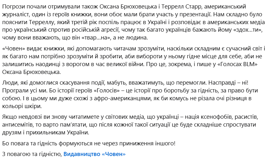 Из комментариев в интернете агрессия перешла в офлайн и воплотилась в звонки с угрозами в адрес издательства, автора книги Оксаны Брюховецкой и героя "Голосов BLM" американского журналиста Террелла Старра, который должен был участвовать в презентации, говорится в сообщении.