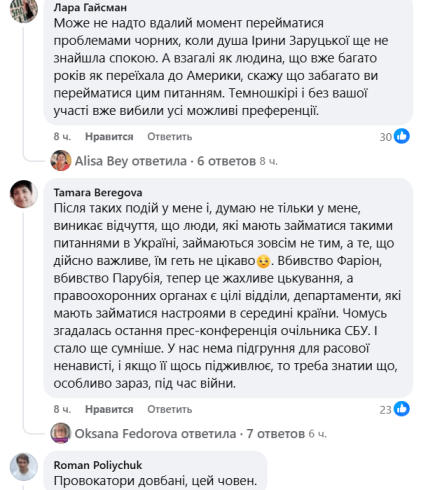 "Ни один из них не читал книги, не понимает контекста, о котором писала автор, и почему это исследование важно для украинских читателей именно во время российской агрессии против Украины. (Нам всем сегодня стоит осознать: без понимания сложных внутренних американских процессов мы не можем рассчитывать на ту общественную и политическую поддержку США, в которой сегодня так нуждаемся в условиях войны). Все сводилось к манипуляциям трагедией Ирины Заруцкой и тем фактом, что ее убийцей стал чернокожий американец", – говорится в публикации.