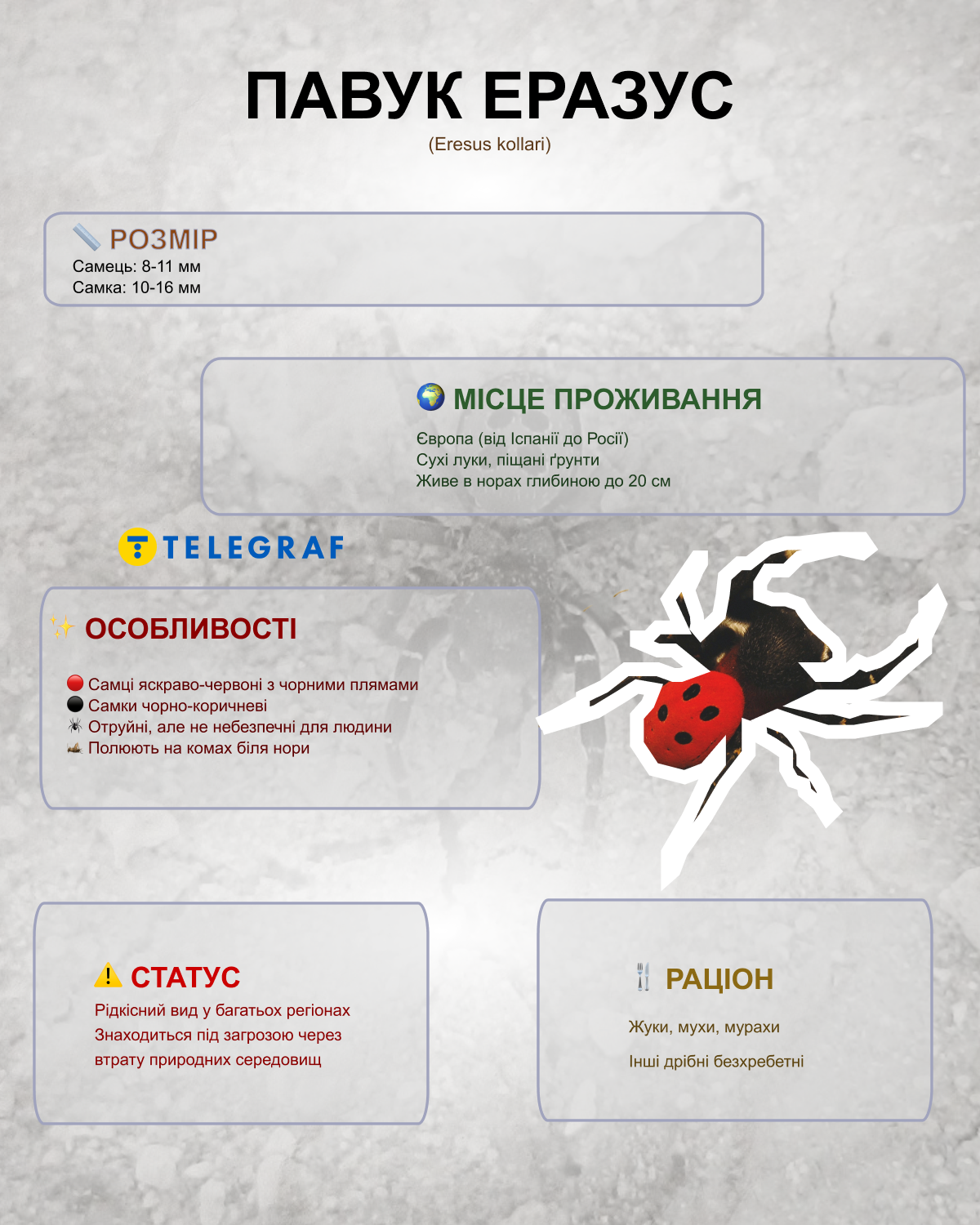 Паук-эрезус (Eresus sandaliatus или Eresus kollari) относится к семейству пауков-ерезид. Самцы действительно отличаются яркой окраской — красно-оранжевым головогрудями с черными пятнами, тогда как самки имеют более скромный темно-коричневый цвет. Эти пауки живут в норах в почве и охотятся на насекомых.