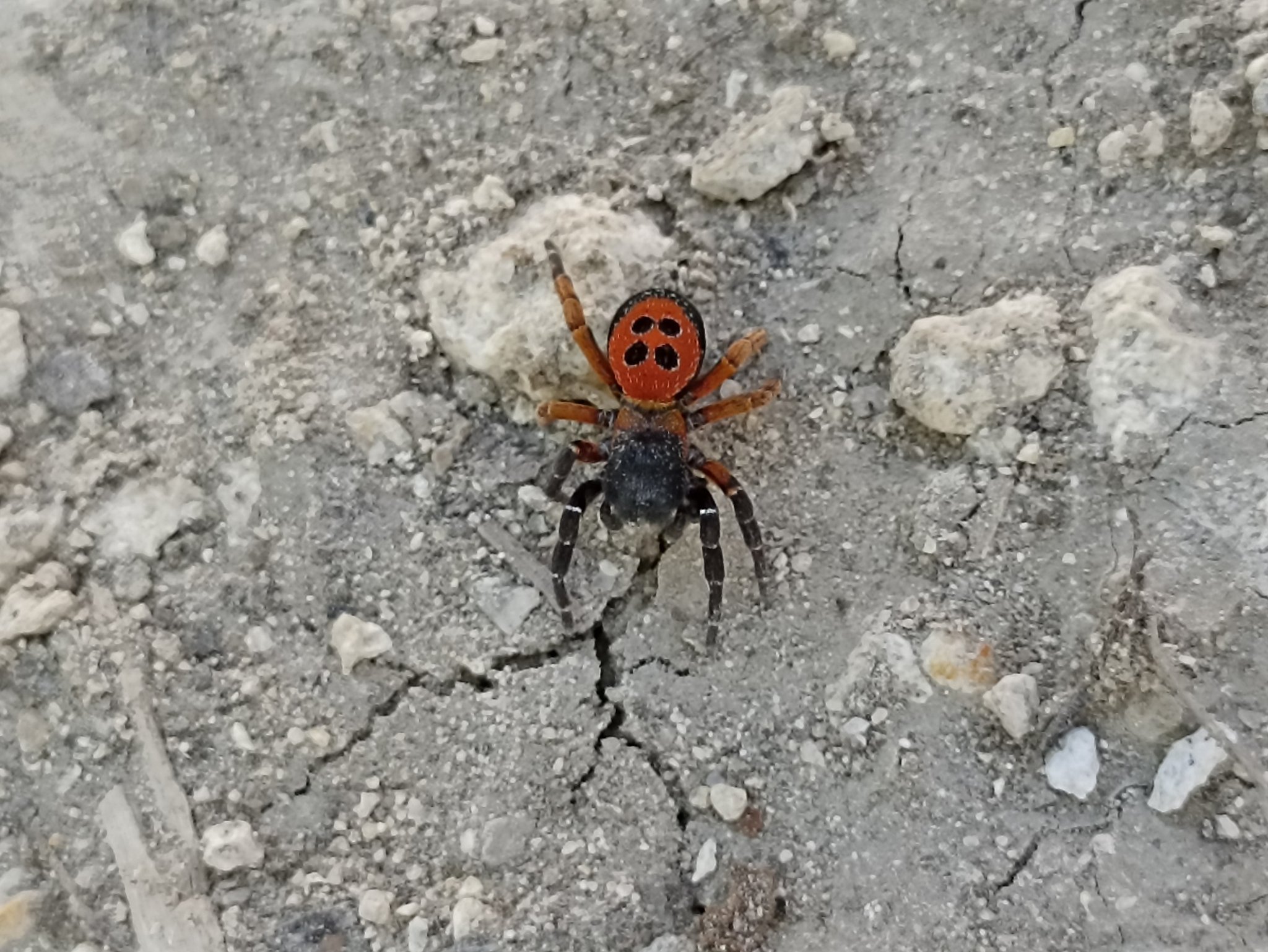 На снимке видно небольшого паука с ярким оранжево-красным головогрудью, украшенным характерным черным узором, напоминающим четыре больших пятна или "глаза". Тело паука контрастное — верхняя часть алая, а задняя часть и ноги черные с коричневыми оттенками. Паук сидит на серой каменистой почве, демонстрируя свою уникальную колористику, которая действительно может напоминать солнышко или божью коровку.