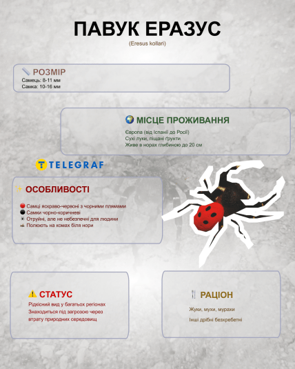 Паук-эрезус, которого в народе называют "солнышком", появился в Украине в конце сентября. Членистоногуе животное заметили рядом с Днестровским каньоном.