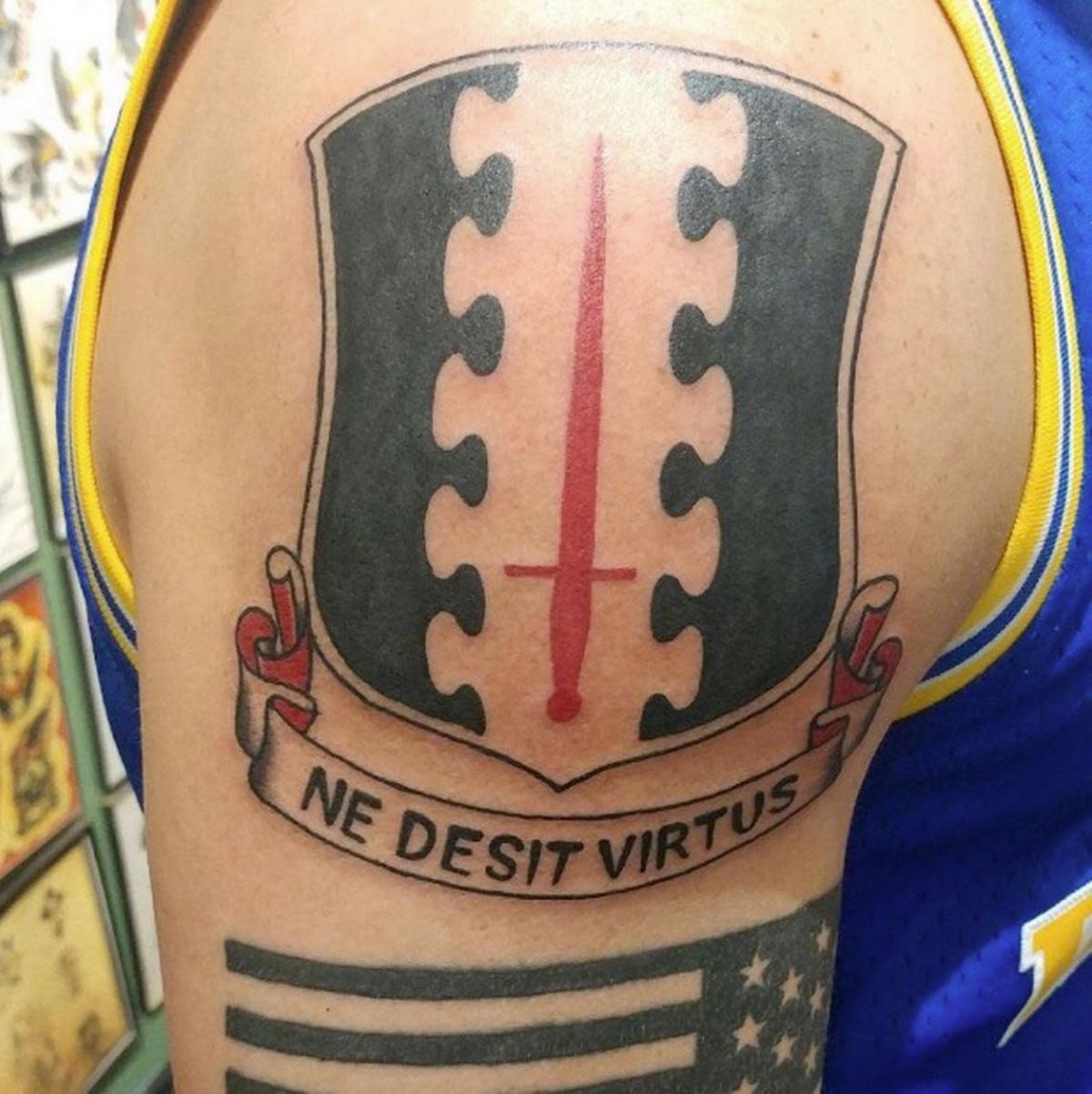 Большой татуировкой Хегсета является нашивка 187 пехотного полка армии США, где он проходил военную службу. Его девиз — Ne Desit Virtus ("Пусть не исчезает отвага"). А на плече у офицера изображен шеврон этого подразделения. Полк участвовал во Вьетнамской войне, войне в Персидском заливе и войне в Ираке.
