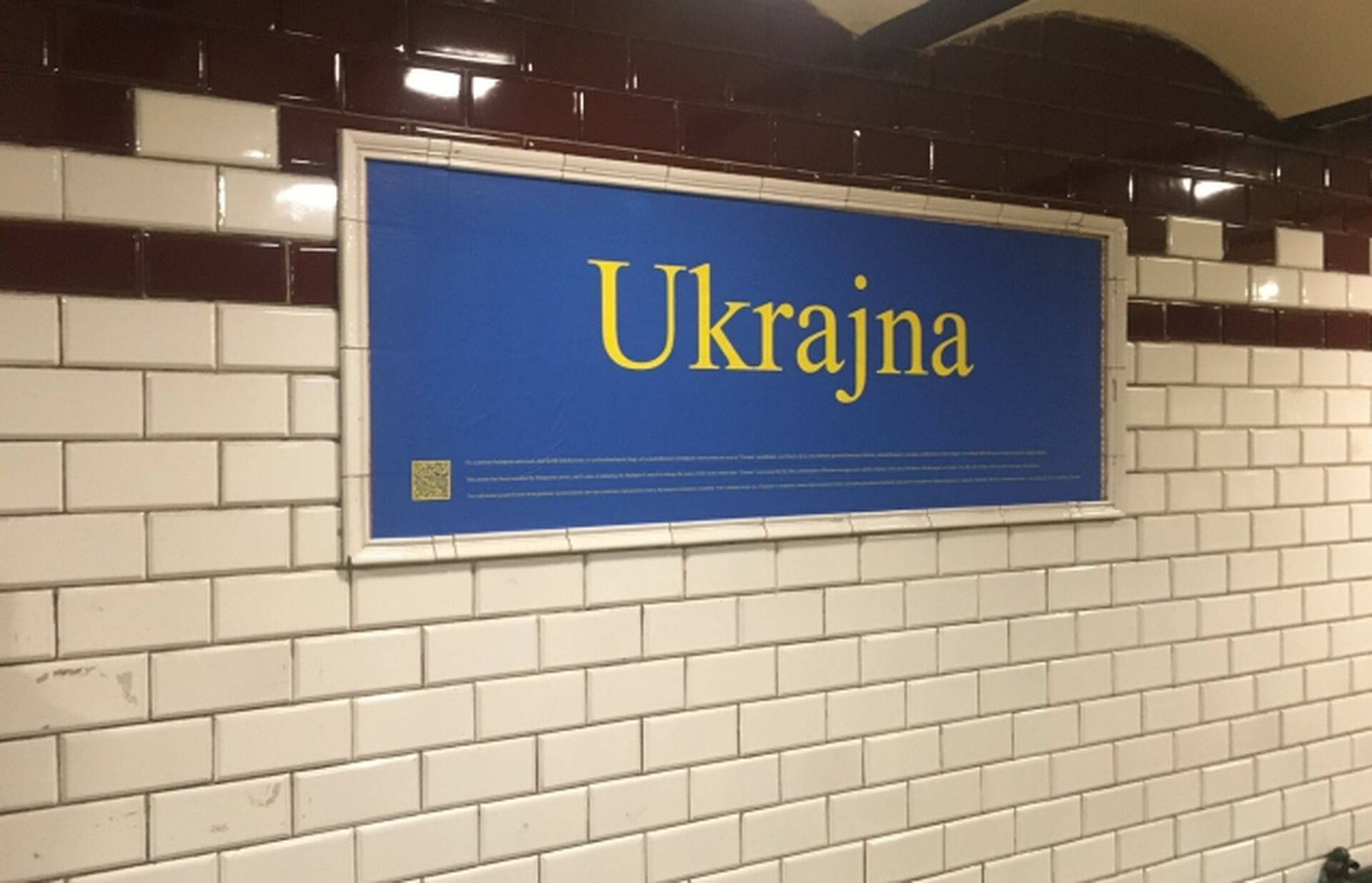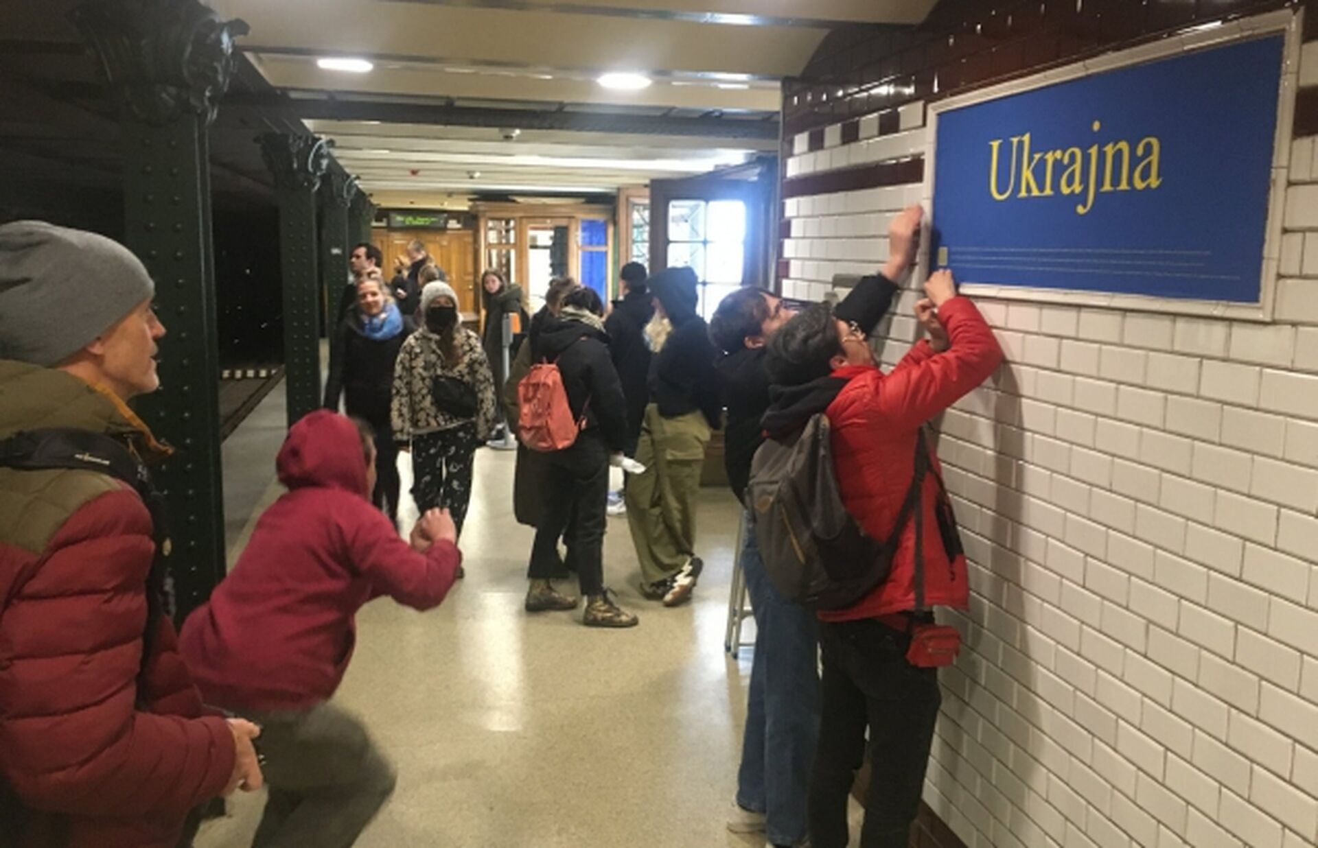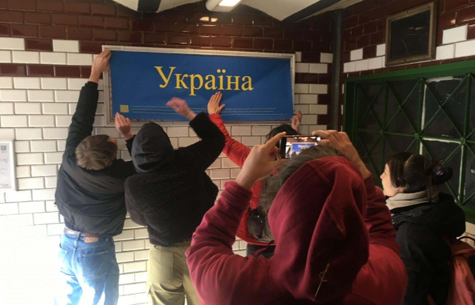 На станции появились наклейки и небольшие таблички на лестнице с новым названием, что символически подчеркивает поддержку Украине.