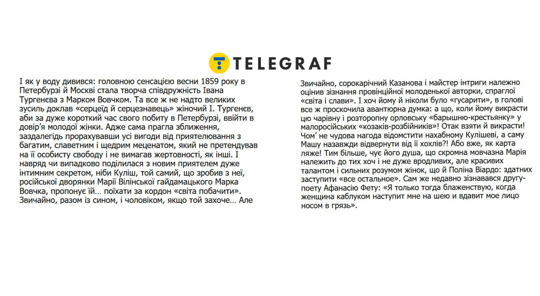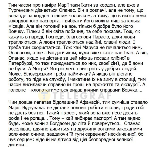 Есть отрывок, показывающий момент, когда Марко Вовчок, уже известная писательница, знакомится и сближается с Иваном Тургеневым. Их творческое сотрудничество быстро переходит в доверительные отношения. Она сама стремится к этому сближению, ибо видит в этом пользу и поддержку от влиятельного человека. При этом в письмах и разговорах упоминается Кулиш, который и раньше играл важную роль в ее жизни, и теперь предлагает ей путешествие за границу.