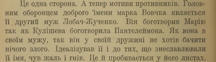 Если почитать жизнеописание Марко Вовчка, то можно найти этот отрывок. То есть Лобач-Жученко очень любил и защищал Марка Вовчка, считал ее безгрешной даже когда ее критиковали. Он идеализировал жену так же, как она когда-то идеализировала Кулиша.