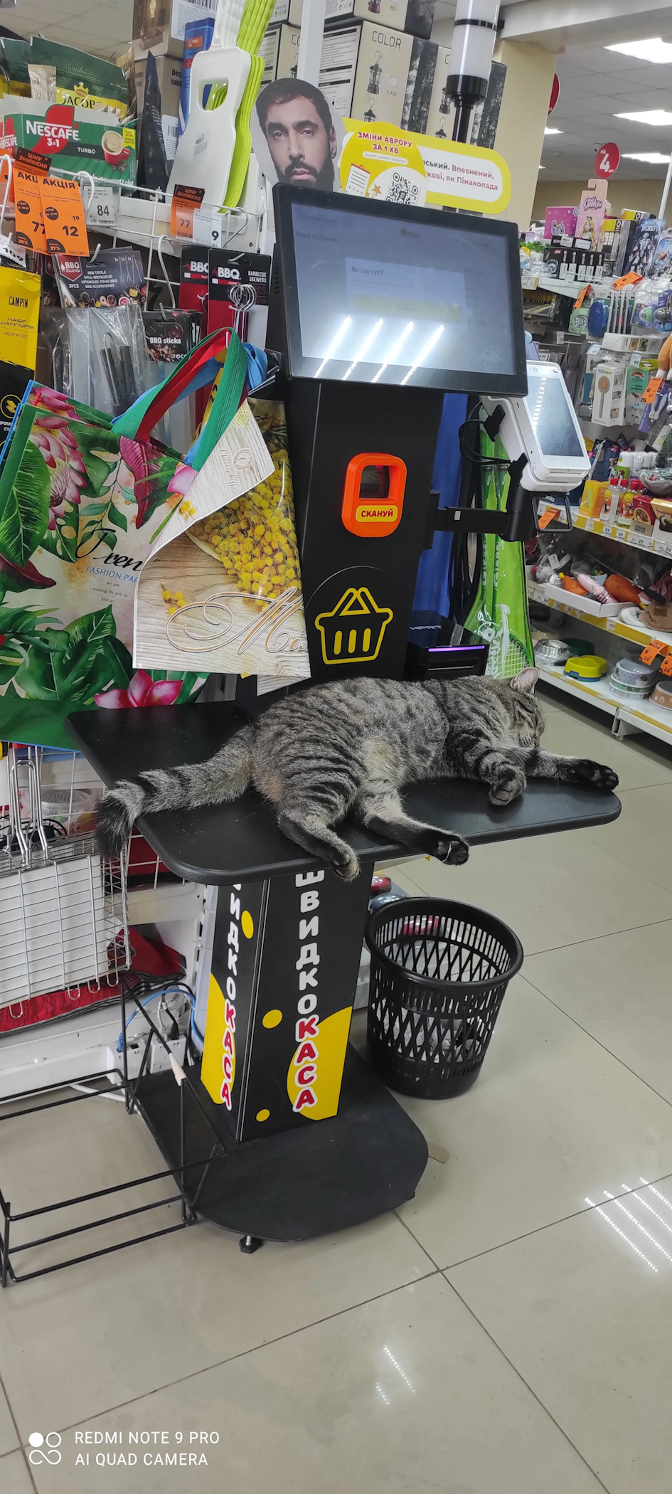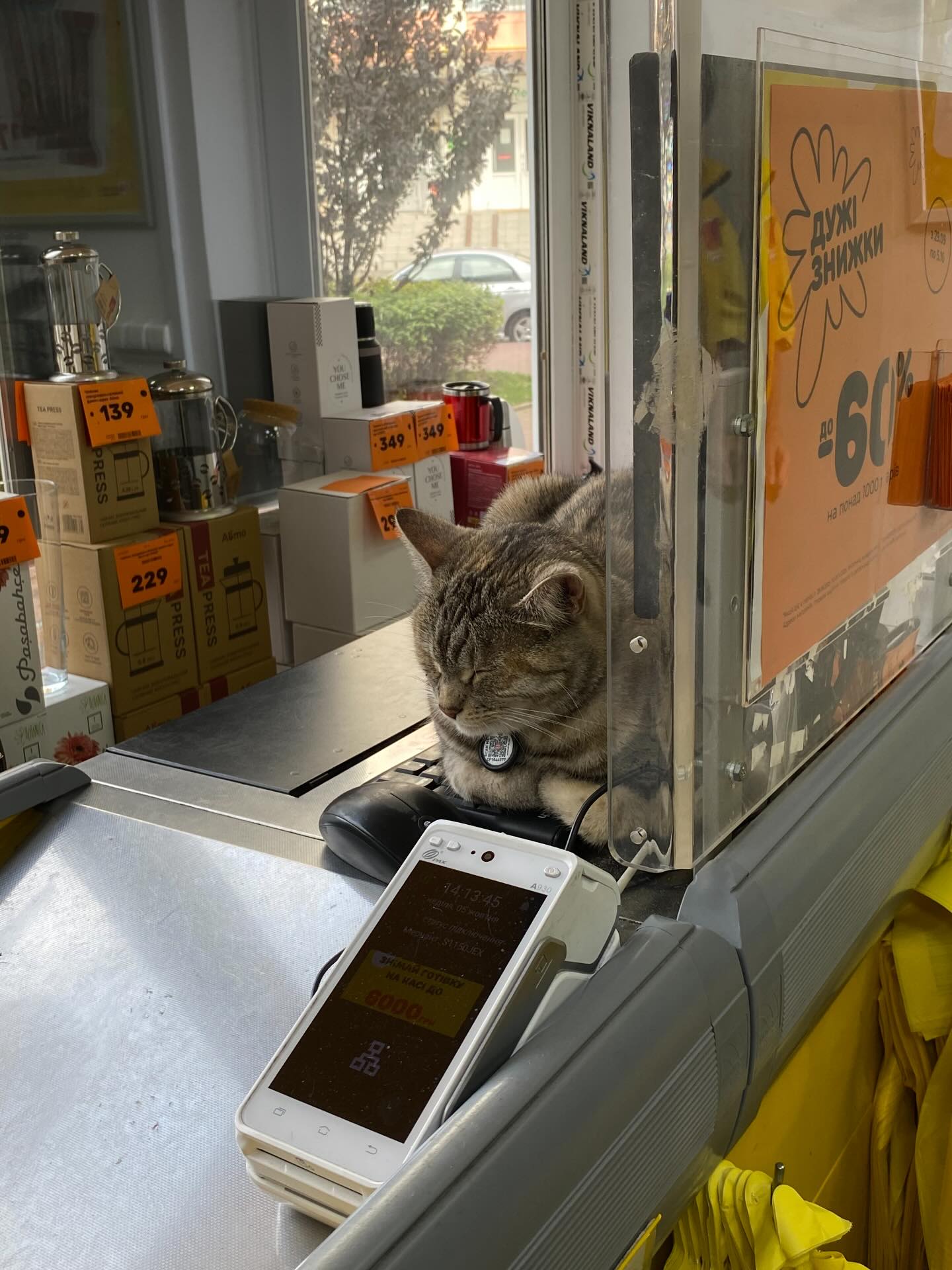 Кот дремал на клавиатуре на кассе одного из мультимаркетов "Аврора" в городе Кременчуг. Пушистик выглядел, как настоящий кассир, немного заскучавший в ожидании покупателей.