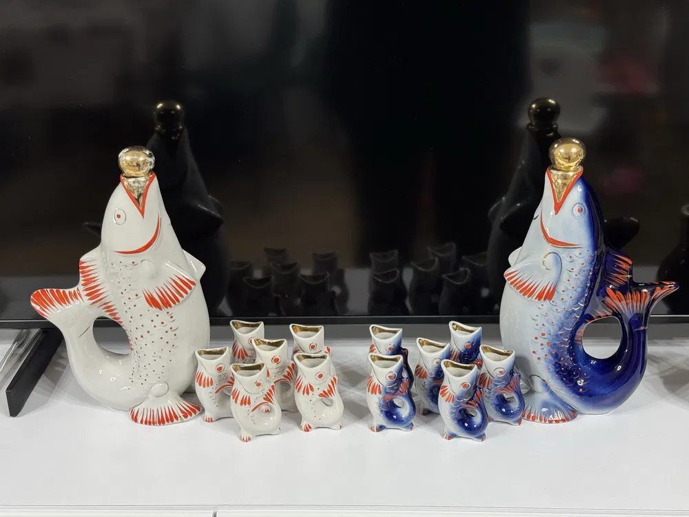 Набор "Рыбки" — это легендарный сервиз периода СССР, состоящий из графина в виде карпа и шести стопок-рыбок. Он стал символом той эпохи, украшая серванты почти каждой семьи.