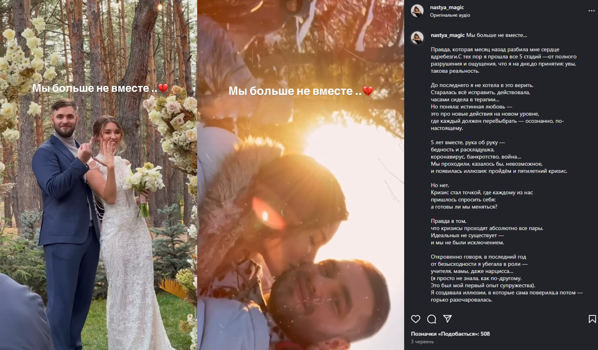 В июне 2025 года девушка рассказала своим подписчикам, что она с блогером больше не вместе. Причиной развода, по ее словам, стал 5-летний кризис в отношениях.