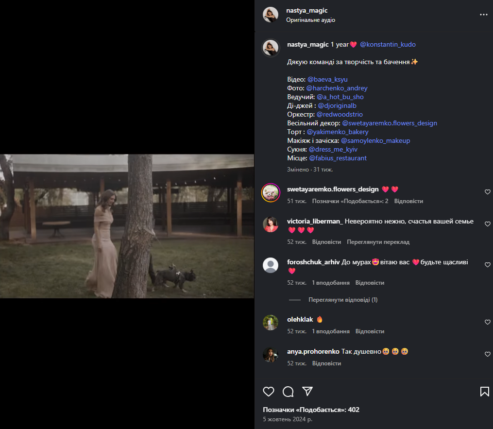 5 октября 2024 года Климова выложила праздничный пост в честь годовщины свадьбы.