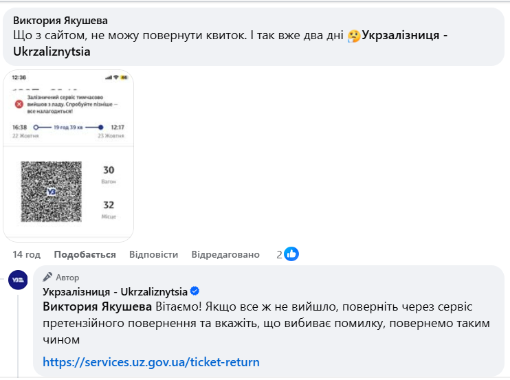 Украинка под одной из публикаций "Укрзализныци" на собственной Facebook-странице пожаловалась, что два дня не может вернуть билет на сайте УЗ. При попытке вернуть билет у женщины появлялось сообщение "железнодорожный сервис временно вышел из строя. Попробуйте позже".