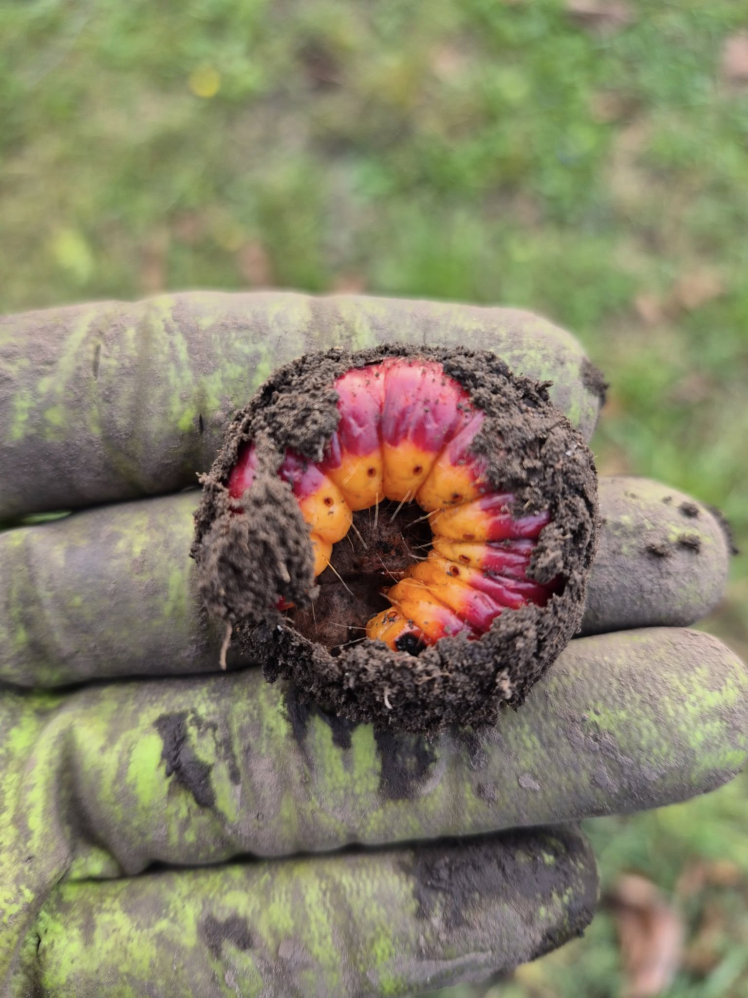 В Украине похолодало и насекомые устраиваются на зимовку. Украинка нашла в земле огромную малиновую гусеницу, которая вредит деревьям.