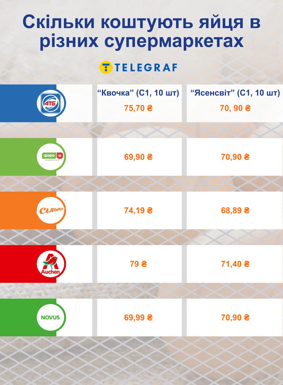Самая высокая стоимость яиц "Квочка" и "Ясенсвіт" — в Ашане (79,00 грн и 71,40 грн). Самые дешевые яйца продают в Форе (69,90 грн) и в Сільпо (68,89 грн) соответственно.