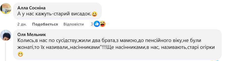 В комментариях под постом пользователи предлагают свои варианты и делятся, как "холостяков" называли в их регионах. В частности, "старий висадок", "насінник", "сивояй", "одинак".