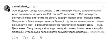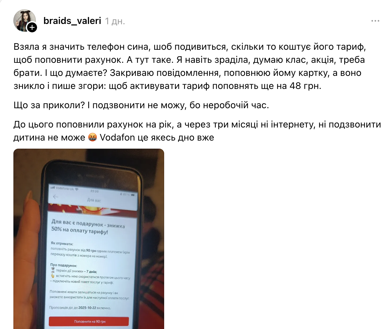 Как рассказала Валерия в Threads, у нее произошла неоднозначная ситуация с "Водафоном". Оператор предложил скидку на пополнение мобильного, но она не сработала.