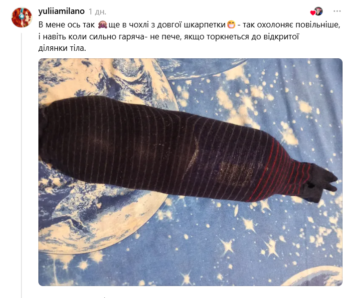 В комментариях под постом пользователи предлагают запихнуть эту грелку в длинный носок (можно использовать любой другой тканевый чехол). Так не только дольше будет удерживаться тепло, но и защитите кожу – если вода слишком горячая, бутылка не жжет открытые участки тела.