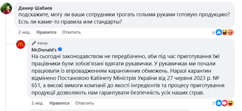 "В перчатках мы начали работать с внедрением карантинных ограничений. В настоящее время карантин отменен Постановлением Кабинета Министров Украины от 27 июня 2023 г. № 651, а высокие требования компании к качеству ингредиентов и процессу приготовления продукции позволяют нам гарантировать безопасность всех наших блюд", – говорится в ответе.