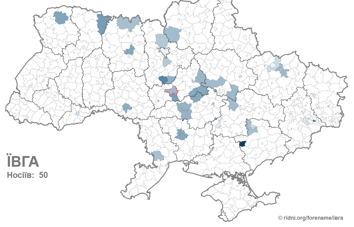 Наибольшая концентрация этого имени в одном из районов Запорожской области – там одна Ївга приходится на 6268 человек. Это имя в большинстве своем распространено на севере и в центре Украины. Во многих областях его владелиц нет вообще, что не удивительно, учитывая, как мало украинок его носит.