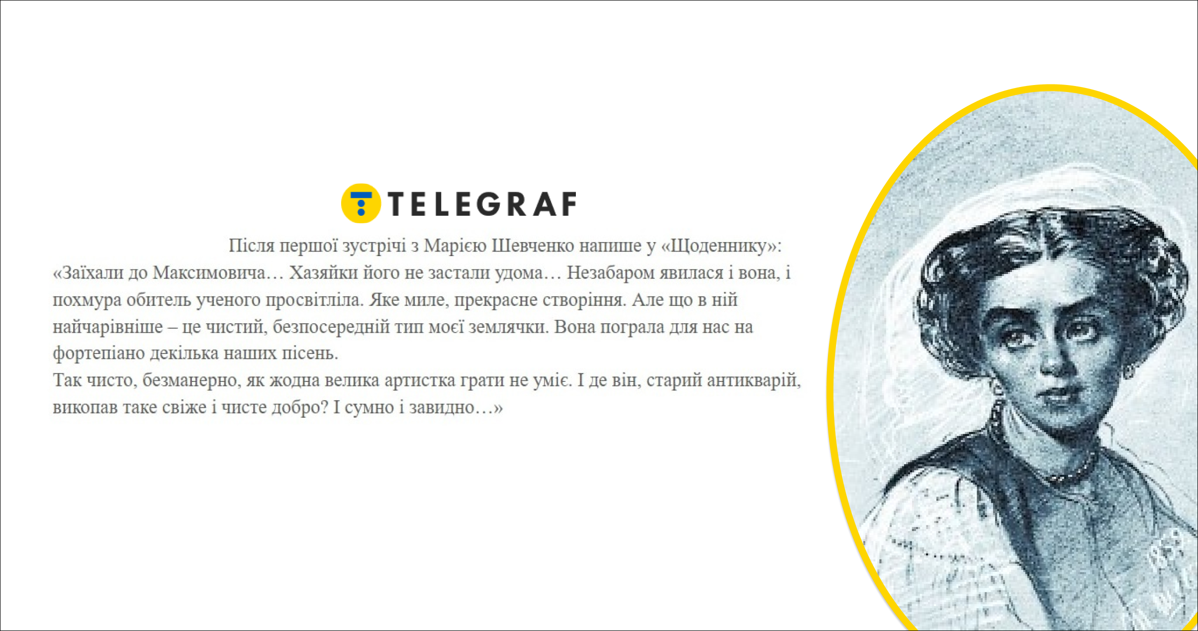 Самой большой загадкой в жизни Шевченко остаются его отношения с Марией Васильевной, женой Михаила Максимовича. Впервые они встретились в 1858 году в Москве: Марии было чуть больше 20, а ее мужу — 54. Несмотря на пятилетний брак, у них не было детей. После первой встречи Шевченко записал в "Дневнике", что мрачный дом Максимовича ожил благодаря появлению Марии.