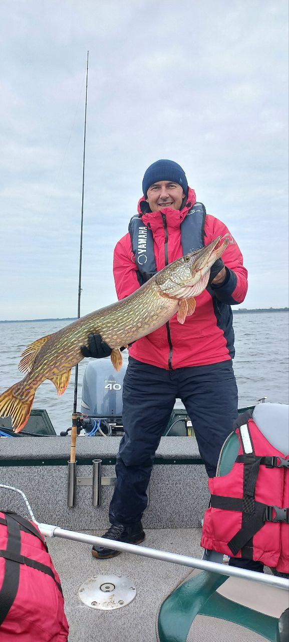 Щука потянула на 8,4 кг, но длину гигантской рыбины Андрей не указал. На фото видно, что это просто "королевский" улов – размер превышает длину его туловища вместе с головой.