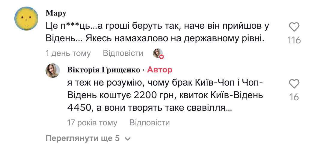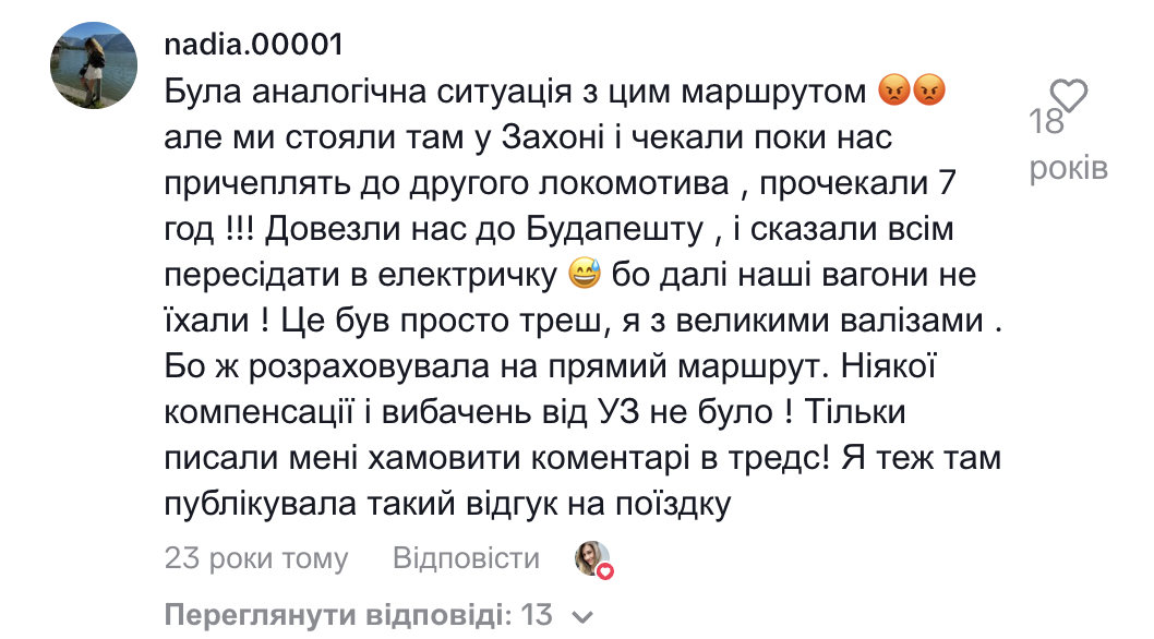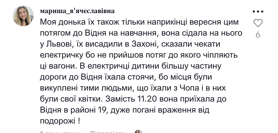 Автор видео побежала на электричку, которая закрыла дверь буквально после того, как она вбежала в вагон. Почему-то электричка не ждала пассажиров, которым предложили пересадку, поэтому многие не успели. Происходило это все в 4 утра. Дальше женщина уже своими силами доехала в Вену, но вопросы к УЗ у нее остались. По словам пассажирки, она написала жалобу и ждет ответа.