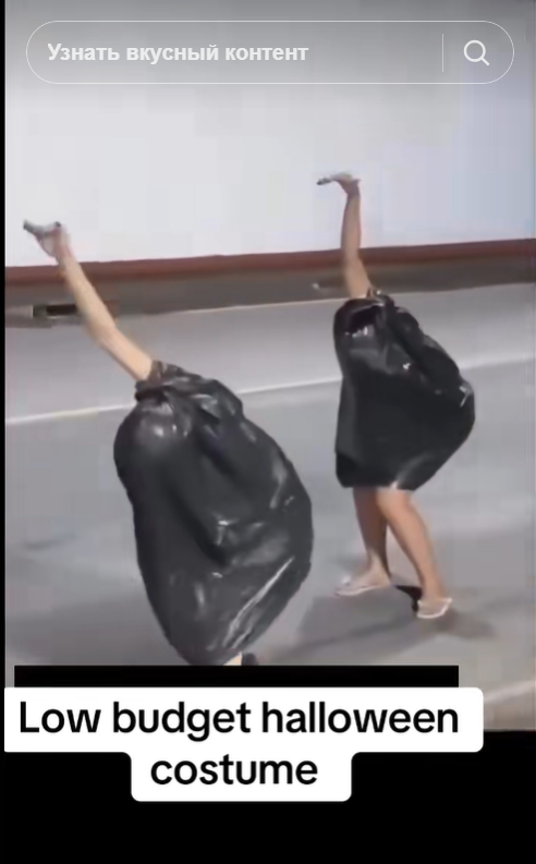 В этом случае придется немного заморочится, но получается очень смешно и при этом весьма бюджетно. Все что вам нужно, это большие мусорные пакеты, лучше всего черные. Сделайте в них отверстия для ног и одной руки, наденьте на себя и спрячьтесь в этом пакете, достав одну руку. Со стороны вы будете выглядеть, как страус. И вперед — к веселым фото и видео для соцсетей на Хэллоуин.