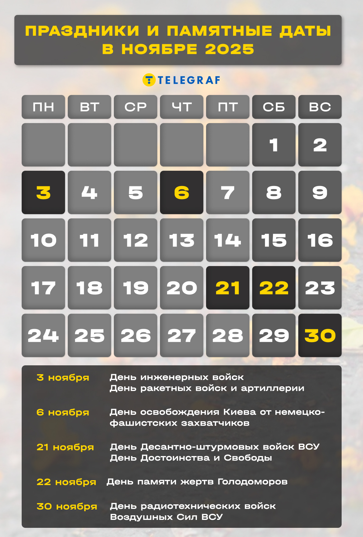Всего в ноябре 2025 года 30 календарных дней. Из них 20 дней — рабочие и 10 дней — выходные. Также в последний месяц осени украинцы будут отмечать несколько важных дат и профессиональных праздников. В большинстве своем они касаются Вооруженных сил Укарины. Также в ноябре в Украине чтят жертв Голодомора и День достоинства и свободы в память о Евромайдане 2014 года.