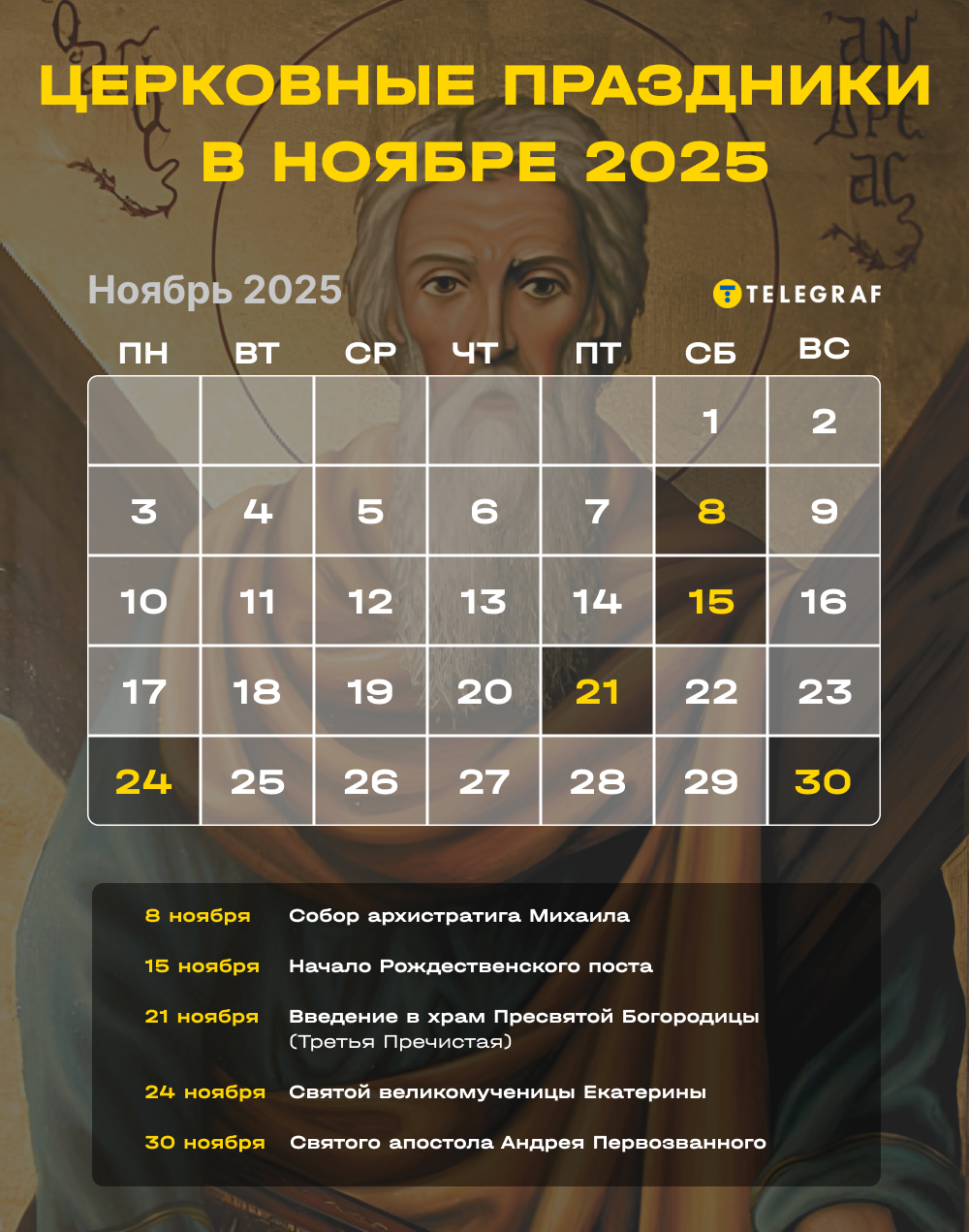 Церковный календарь на ноябрь 2025 года по новому стилю