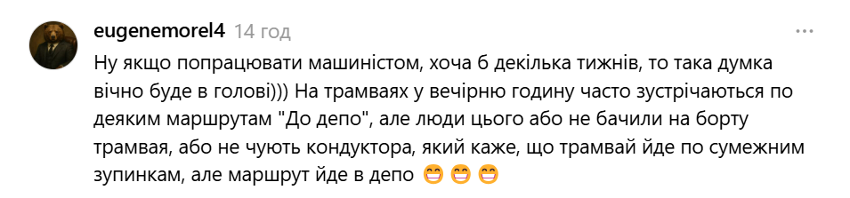 Ну, если поработать машинистом, хотя бы несколько недель, то такая мысль постоянно будет в голове. На трамваях в вечерний час часто встречаются по некоторым маршрутам "В депо", но люди этого либо не видели на борту трамвая, либо не слышат кондуктора, который говорит, что трамвай идет по смежным остановкам, но маршрут идет в депо, — пишет один из комментаторов