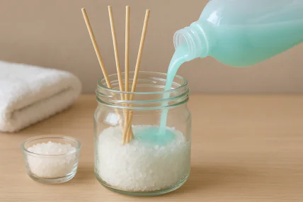 Чтобы приготовить домашний ароматизатор, понадобится небольшая емкость – стакан, пиала или даже обрезанное дно пластиковой бутылки. Внутрь всыпают 3–4 столовых ложки поваренной соли и добавляют 1–2 колпачка кондиционера для стирки.