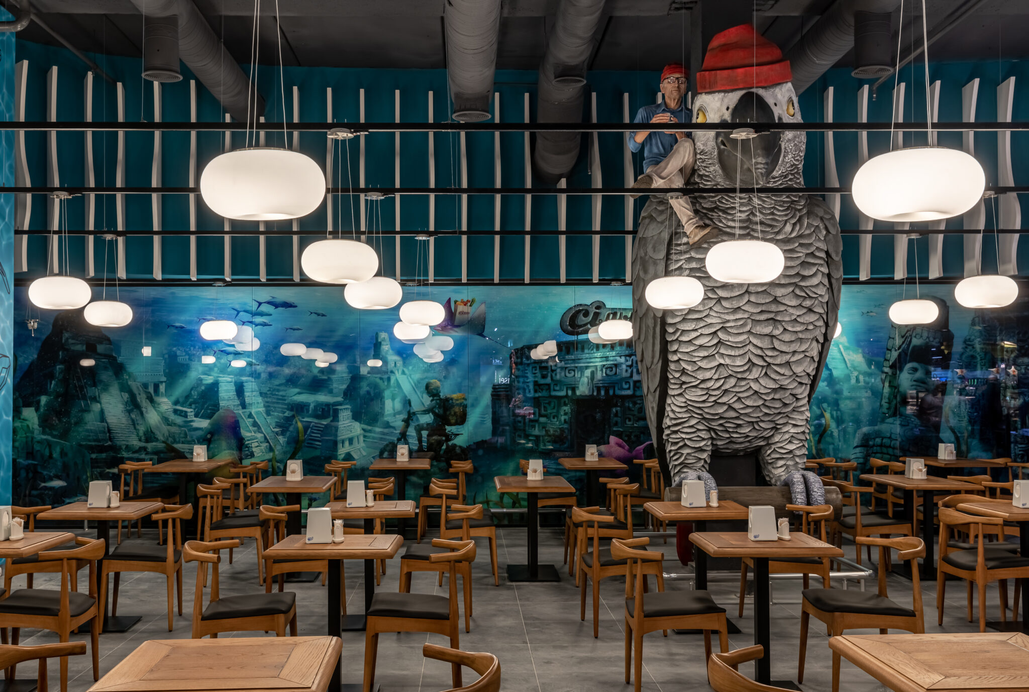 А возле кафе гостей встречает гигантский попугай Жако — старый добрый Жак-Ив Кусто в красной шапочке, который приглашает присесть рядом и погрузиться в атмосферу приключений.
