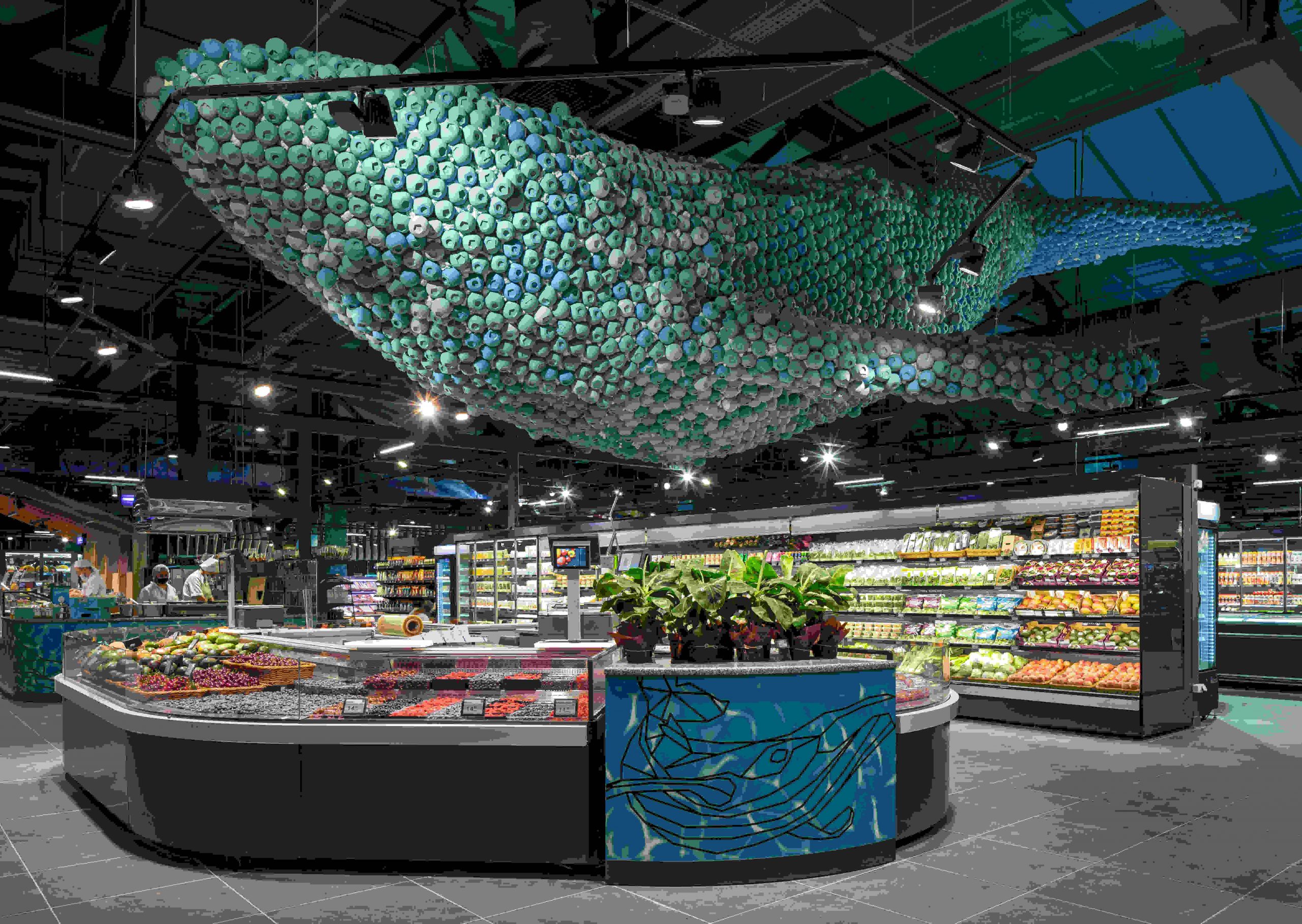 В магазине "Сільпо" в Одессе торговый зал оформлен в морском стиле, а над головами покупателей "проплывают" киты, косатки и черепахи.