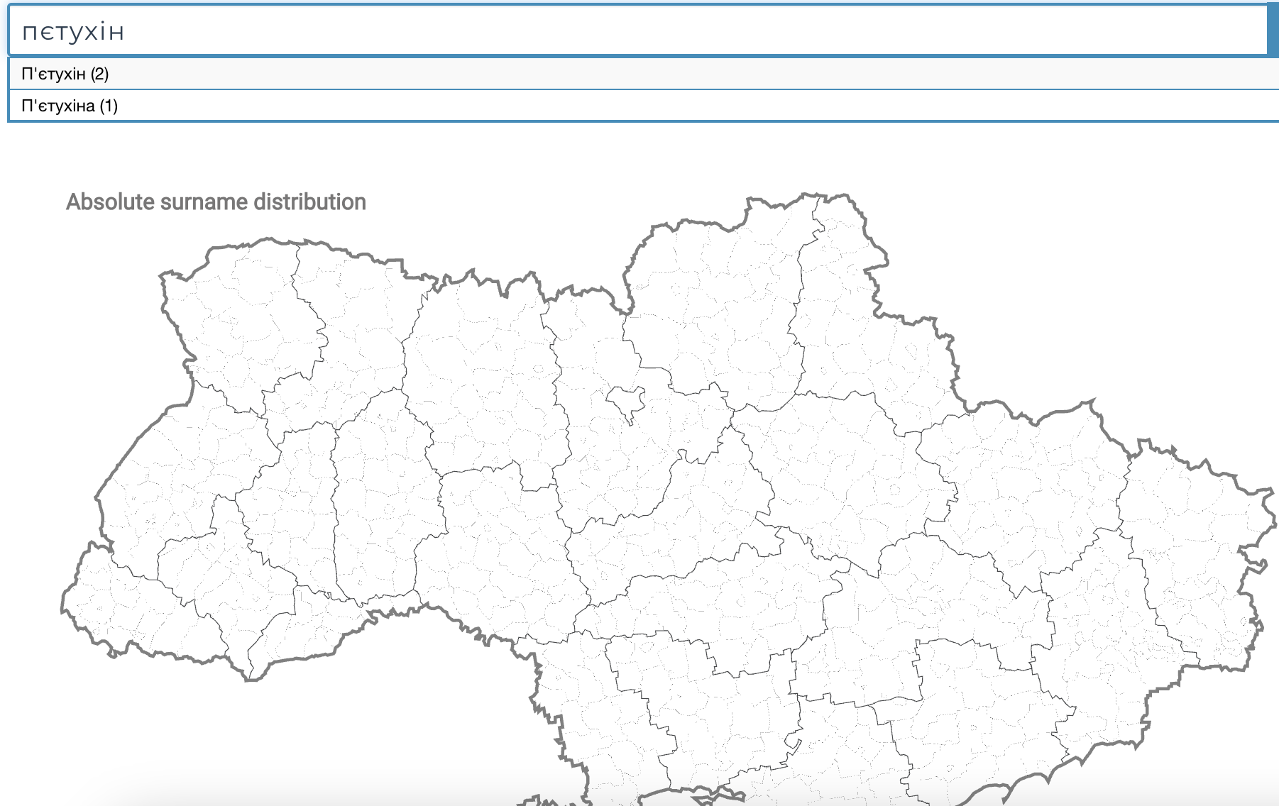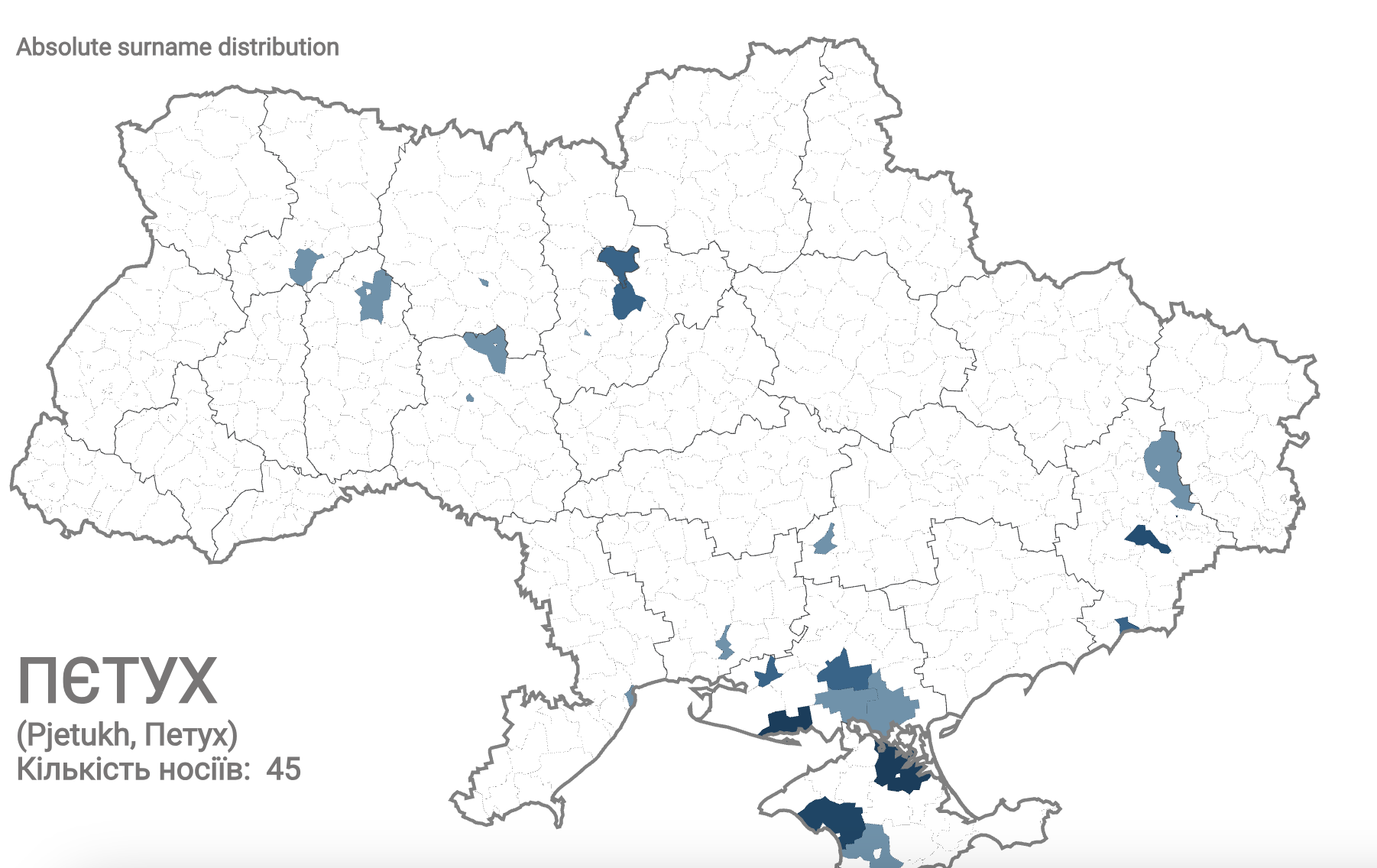 Чаще ее носят женщины по имени Татьяна. Если смотреть на распространение фамилии по областям, то видно, что наибольшее количество Петуховых в Киеве и Харьковщине, и Донбассе.