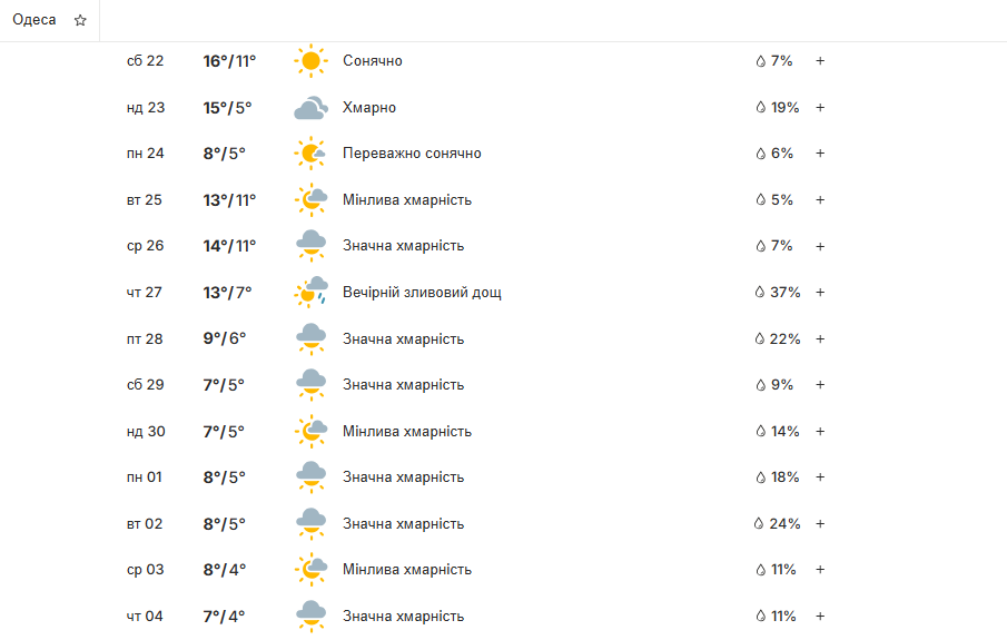 Облачная погода также накроет Одессу, но столбики термометра до 28 ноября останутся в диапазоне +13…+15 градусов, ожидается небольшой дождь. Похолодание придет с 29 ноября, но без осадков.