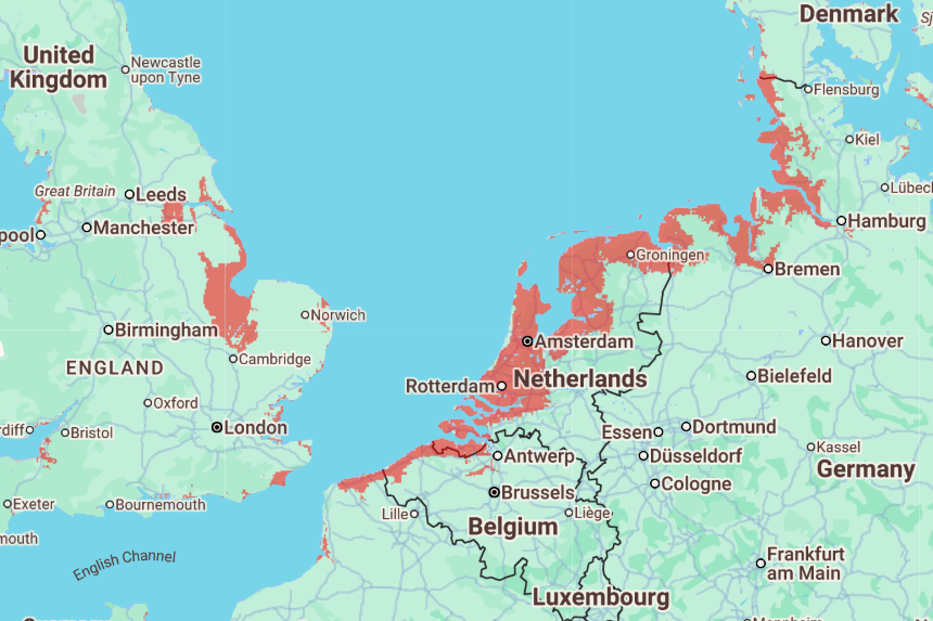 Места в Британии, Бельгии, Нидерландах, Германии и Дании, находящиеся в зоне риска