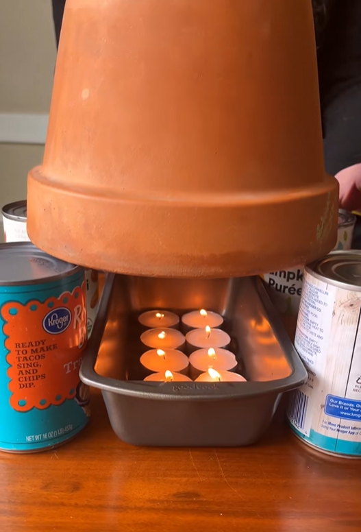 Подставкой для самодельного обогревателя могут послужить обычные консервные банки, как демонстрирует блогерша на видео внизу. Посередине ставится противень, на котором присутствуют несколько чайных свеч. Сверху на банки американка ставит терракотовый горшок. Он нагревается теплом от свечей и постепенно отдает его в помещение.