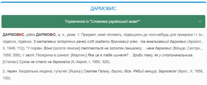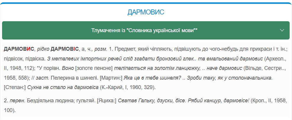 По данным "Словаря украинского языка", "дармовис" имеет два основных значения. Первое значение – это небольшая подвеска, отделочный элемент или мелкий свободно свисающий предмет. Это может быть украшение, декоративный элемент или что-то вроде брелока. Поэтому ближайший российский аналог — "брелок", хотя он не полностью охватывает украинский смысл.