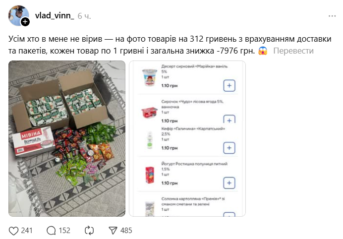 Такой пост опубликовал пользователь Threads. "Всем кто у меня не верил — на фото товаров на 312 гривен с учетом доставки и пакетов, каждый товар по 1 гривне и общая скидка -7976 грн ", — отметил он.