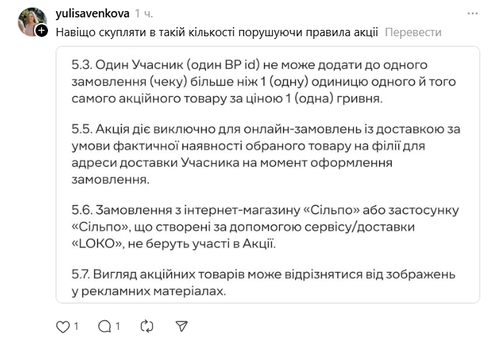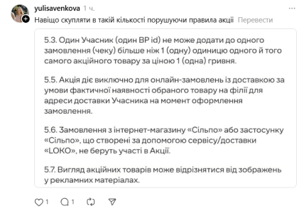 В сети появилась история от пользователя, которому якобы удалось "поймать" акционные товары на более чем 8 000 гривен, но по факту заплатить лишь 312 гривен. Однако по правилам акции можно выбирать только одну позицию товара по акционной цене. В комментариях его осуждают за то, что он "обманул систему".