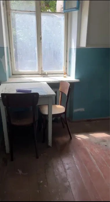 В кухне хозяйка жилья показала старые окно, стол и два деревянных стула того же периода. Что касается плиты и раковины, их на фото не видно. Скорее всего, это оборудование в квартире отсутствует. Деревянный пол покрашен коричневой краской, а стены – голубой и белой. Это традиционная отделка 80-х. Примечательно, что площадь кухни составляет 10 кв.м, что для хрущевки довольно много.