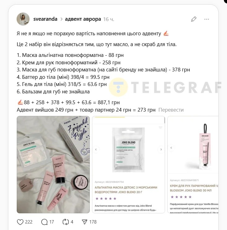 Обычная цена календаря – около 400 гривен. Но его можно приобрести всего за 249 гривен, если докупить товар на 199 гривен или добавить в корзину один из продуктов партнеров акции. Пользователи Threads подтвердили, что это действительно работает.