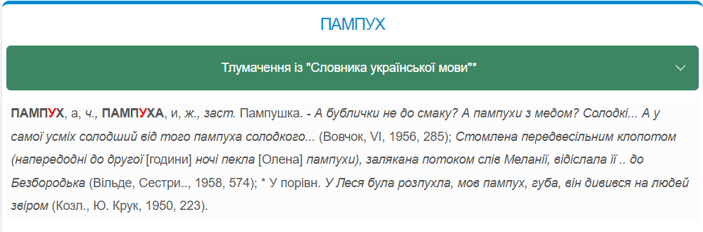 В "Словаре украинского языка" (СУМ) отмечено, что пампух — это разновидность пышки, рыхлой дрожжевой выпечки, которую жарили или пекли, часто с маком, повидлом или медом. В классической традиции их готовили именно к Рождеству. В цитатах писателей слово встречается не раз: "А бублички не до смаку? А пампухи з медом? Солодкі…".