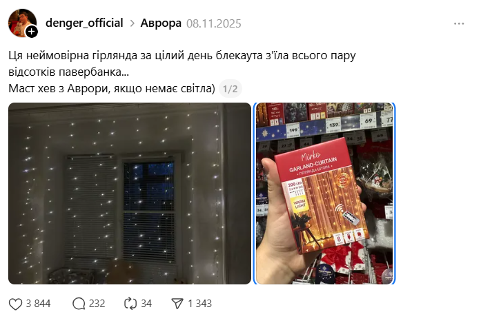 Пользователь Threads показал гирлянду, которая спасет вас во время отключения электроэнергии. Но самое приятное, что она стоит всего 139 гривен.