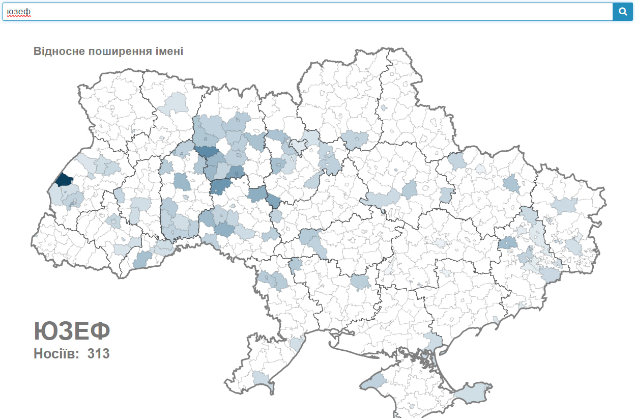 Использование формы Юзеф может указывать на польское влияние. Однако распространено оно гораздо шире, чем области, граничащие с Польшей. По данным портала "Рідні" Юзефов в Украине — 313 и они есть в каждой области, кроме Закарпатской. Лидерами по количеству стали Львовская и Житомирская области.