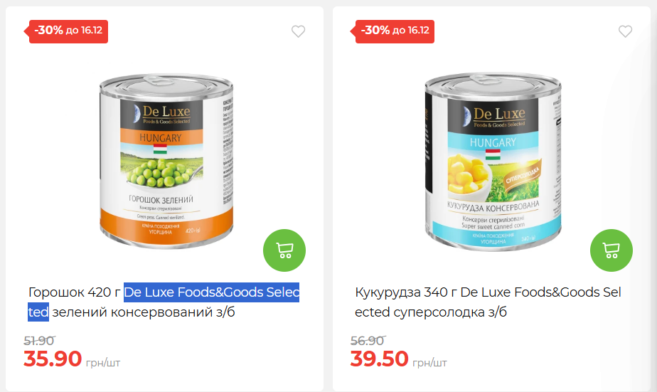 В сети АТБ запустили значительные скидки на зеленый горошек и консервированную кукурузу. Оба продукта производства De Luxe Foods&Goods Selected подешевели почти на треть.