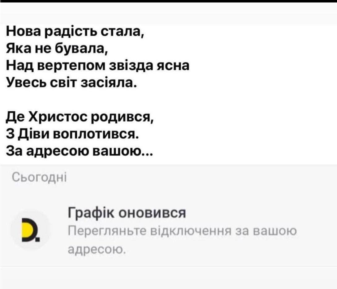 Опубликовали также скрин, на котором вся наша жизнь перед праздниками. Это часть колядки Нова радість, в которой поется, что Христос родился. Сразу под ней – информация об обновлении графика от ДТЭК. Никакие россияне с их попытками лишить нас света не отнимут у украинцев свет Вифлеемской звезды и веры, что добро победит зло.