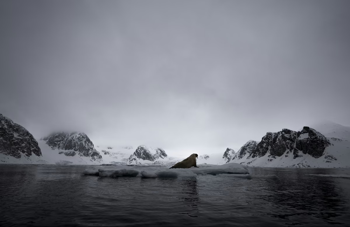 Контрастом выглядит кадр-победитель в категории "Животные в своей среде": морж на льдине у заснеженных гор Шпицбергена, снятый широкоугольным объективом, чтобы показать и животное, и суровый арктический ландшафт.