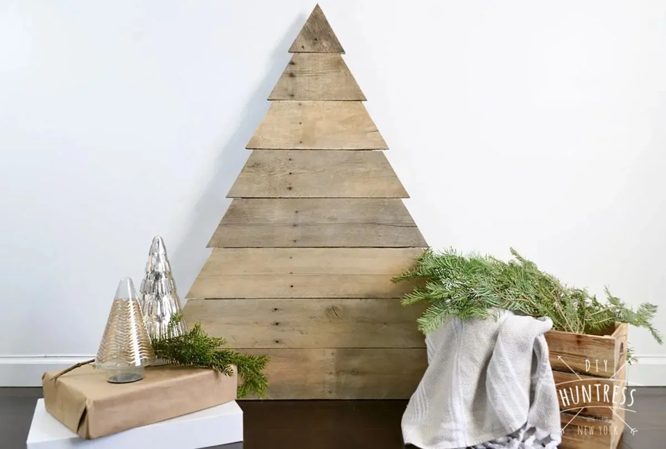 Для любителей минимализма и скандинавского стиля, отличным решением будет елка, сделанная из дерева. Этот декор хорошо впишется, как в городскую квартиру, так и в уютный загородный дом. Елку из дерева также можно украсить гирляндами или зелеными веточками.