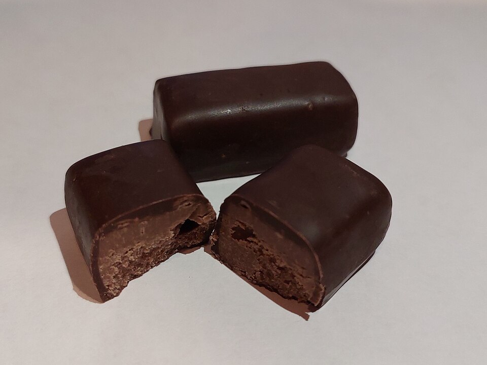 "Кара-Кум" отличают прямоугольная форма, плотная шоколадная глазурь и мягкий корпус из орехового пралине. В текстуре конфеты ощущаются тонкие хрустящие вкрапления – вафельная крошка, символически напоминающая пески пустыни.