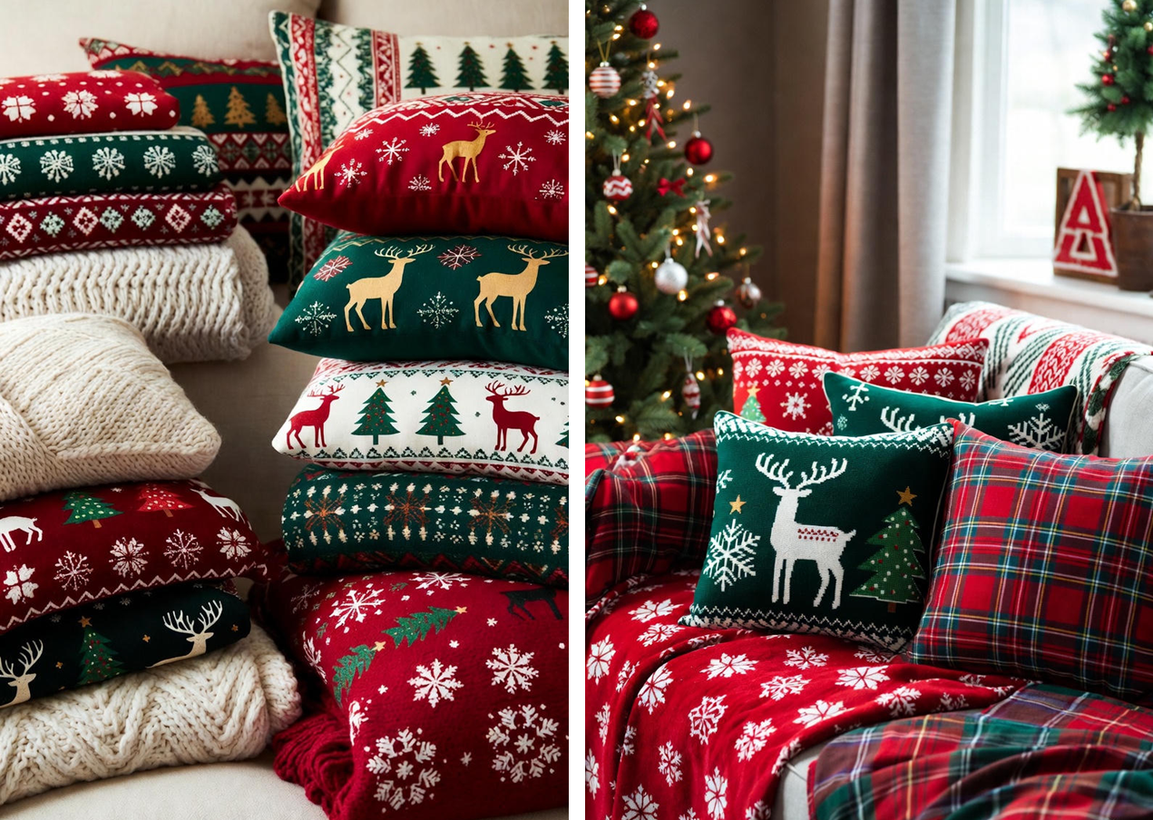 Добавить уюта и праздничной атмосферы в дом можно с помощью теплых пледов и подушек с новогодними рисунками и принтами.