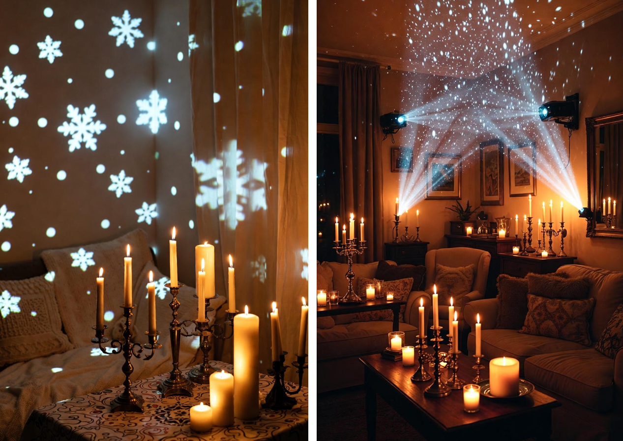 Свечи — отличный элемент декора, который дополнит праздничную атмосферу и добавит в дом уюта. Для украшения дома можно использовать свечи в винтажных подсвечниках и проекторы, которые создают эффект падающего снега на стенах.
